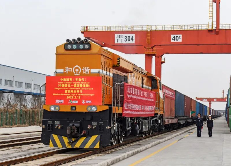 2022年2月18日,中欧班列(齐鲁号)中国青岛—德国曼海姆双向对开首班列车从上合示范区青岛多式联运中心出发。