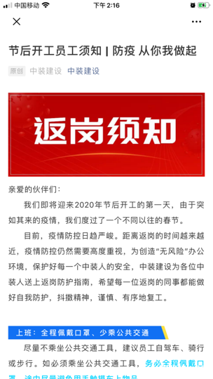 春节前,一场突如其来的肺炎疫情袭击了武汉,并迅速扩撒至全国各地,牵动着我们所有人的心。疫情就是命令,防控就是责任。中装建设第一时间成立疫情防控工作指挥小组,积极应对,同舟共济,共克时艰,坚决打赢疫情防控阻击战,中装建设在行动