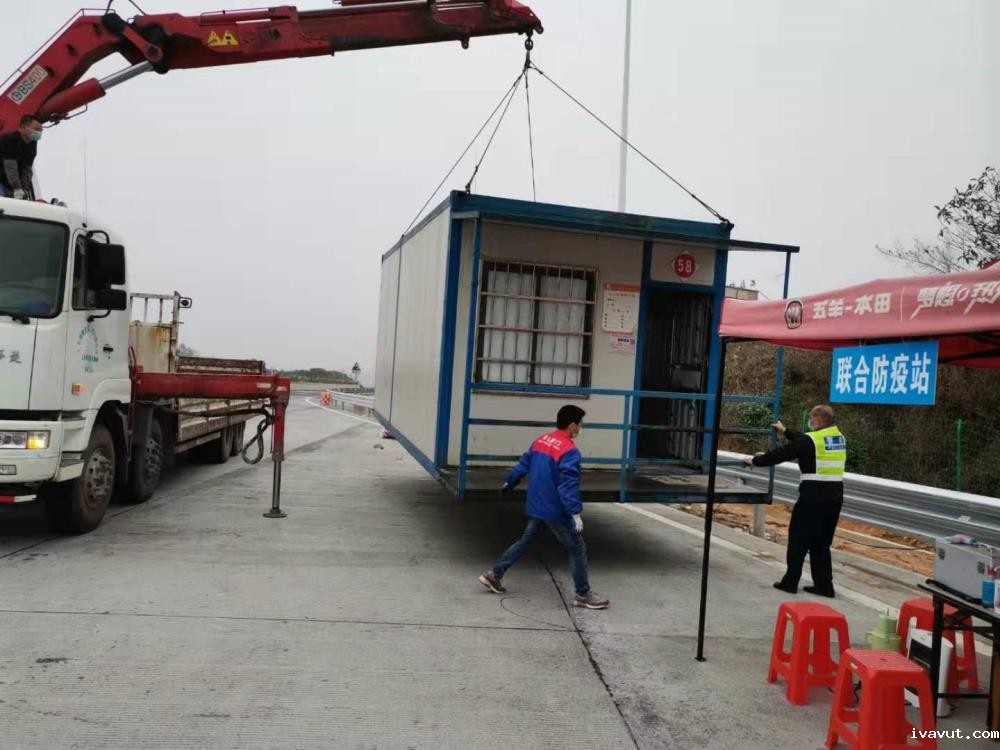 防疫命令发出后,新兴县及各乡镇政府迅速在各高速路口、国道、省道等地点设立临时防疫测温点及检查站。由于许多检查站都是临时搭设,基本上都是简易的帐篷和太阳伞,自防控疫情工作开展以来,他们顶着漫漫寒夜守住防线,阵阵大风如刀割般吹在一线防疫检查站执勤民辅警和工作人员的脸上,同时也掀翻了检查站内的帐篷,夜间检查站所有工作人员与办公设备全部暴露在深夜的寒风中。翔顺建筑领导班子得知情况后,立即要求物资总仓清点剩余的集装箱式简易板房,并联系县公安局将公司现有的18个集装箱式板房送往各高速卡口和乡镇防疫检查站。当接到公司通知,公司物资总仓的几个同事积极响应,第二天一大早用随车吊把18个集装箱装车完毕出发。有些联合检查点要经过村道,路况比较恶劣,当时也有大雾,但司机们都毫无怨言,积极配合公安局把大型的集装箱运送到指点检查点并吊装完成,确保了寒潮来临期间检查站工作人员夜间能够抵御低温寒冷天气。