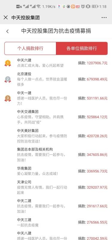 自新型冠状病毒肺炎疫情爆发以来,亿万群众心牵一线,数万中天人也不例外。中天控股集团全体员工在自觉防控疫情的同时,也第一时间参与到了抗击疫情的救助行动中。1月29日,中天控股集团号召发起为抗击疫情的专项募捐,直至2月8日24点,在短短的十一天里,中天爱心慈善基金会共接收到17511笔捐款,14359位中天人参与捐赠,累计捐赠696万元善款,其中中天华南集团累计捐赠33.7万元善款,同时,控股集团同步1:1配捐,捐款总额达到1392万元。