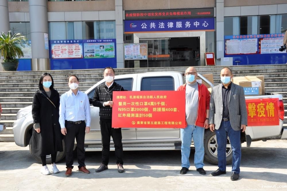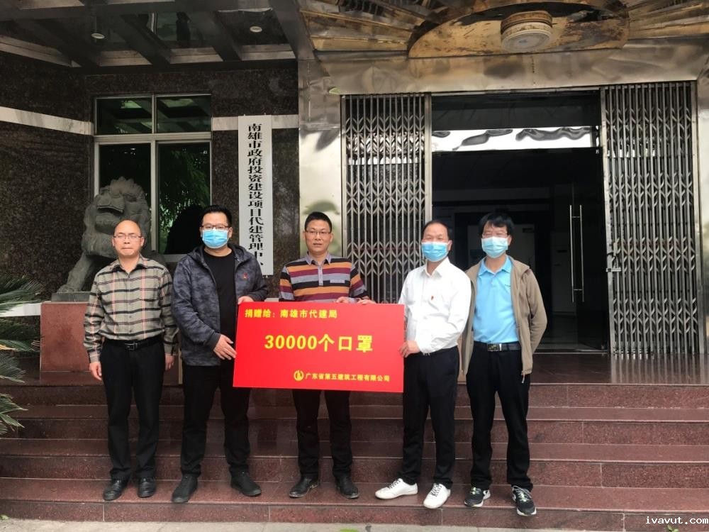 当公司领导了解到韶关市多个县、市疫情防控一线救援防护物资告急的情况后,一方面多途径筹集医用口罩、防护服、护目镜等资源,另一方面号召全体员工为抗击疫情开展爱心捐款活动。公司总经理伍小粦等领导班子率先垂范、以身作则,广大党员群众积极响应、起而行之,募集爱心款项103710元,向新华街道办事处捐出14160元;向乳源瑶族自治县人民政府捐赠45000万个一次性医用口罩、2000个N95口罩、400件防护服、50个红外线测温计;向始兴县新型冠状病毒肺炎疫情防控指挥部捐赠口罩30000个;向南雄市代建局捐赠口罩30000个。五建人以实际行动力所能及地支援着新冠肺炎疫情一线防控工作。缓解了乳源县乡镇防疫物资与南雄市教育系统学校复课前的口罩短缺问题,获得当地政府和群众一致点赞。