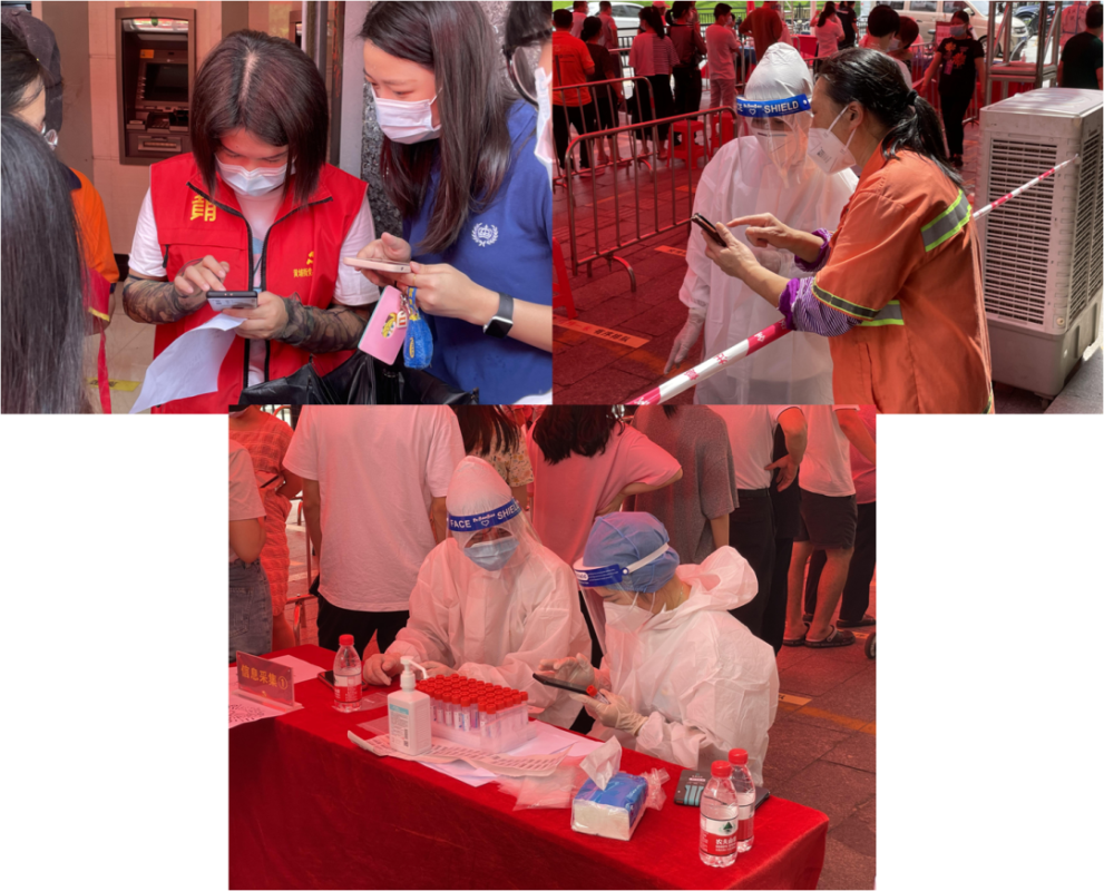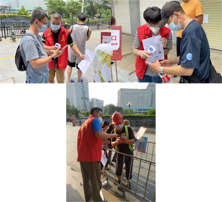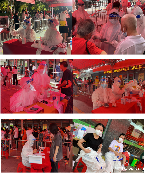在防疫面前,没有局外人。我公司积极协助黄埔街道提供场地及为本次筛查工作解决各类设备供电问题,同时主动派出9名员工作为志愿者投入到核酸检测活动中。志愿者们上午7时便开始在采样点候命。他们要么站在似火骄阳下维持秩序、疏导群众、协助开展小程序操作指导等工作,要么穿上密不透风的防护服,在众多检测者中进行个人二维码信息确认。当天黄埔区气象台发布了高温黄色预警信号。不到一小时,每人都汗流浃背,衣服被汗水浸湿。尤其是脱下防护服后,才发现额头上都是豆大的汗珠,手心都被汗水浸泡得起皱泛白。他们换过衣服,再次穿上防护服,继续投入工作。