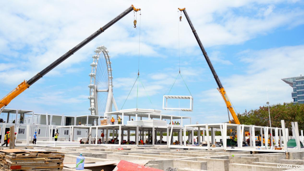 5天完成板房拼装、吊装施工。场内与场外同时拼装,30余台吊车交叉施工,5天时间完成1176个箱体全部拼装。
