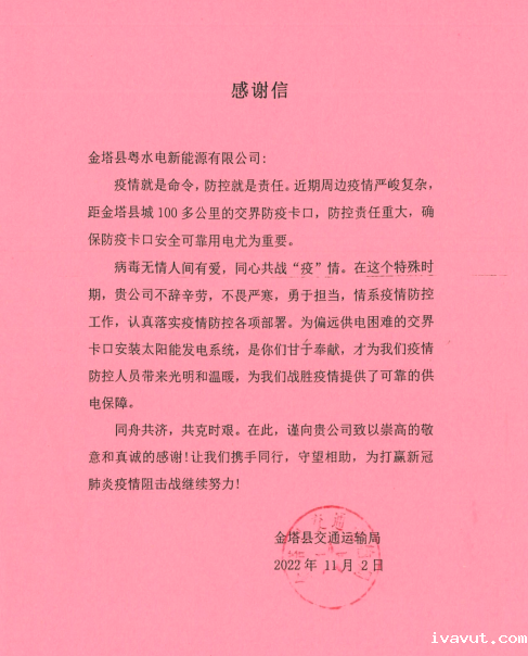 11月2日,粤水电新疆能源公司金塔光伏电站收到一封来自金塔县交通运输局的感谢信。信中,金塔县交通运输局对新疆能源公司为距金塔县100多公里外供电困难的交界防疫检查站提供可靠供电保障表示感谢,表扬了金塔光伏电站对抗疫保供的高度重视和政治担当。