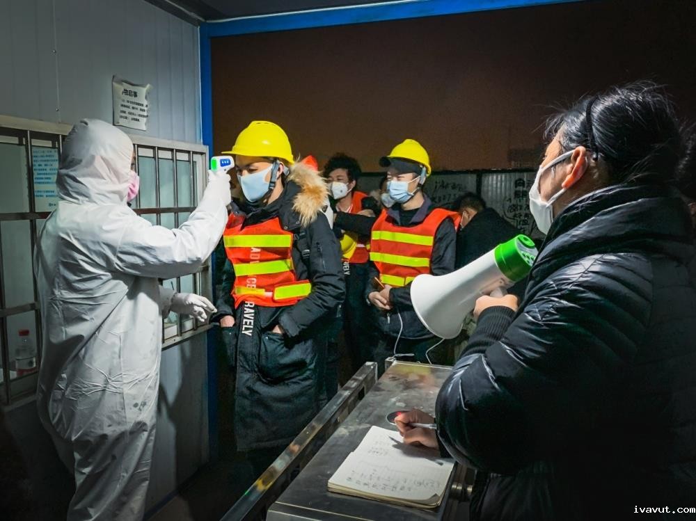 邓小琴手持扩音器提醒中建四局援建雷神山项目工人接受入场前体温测量