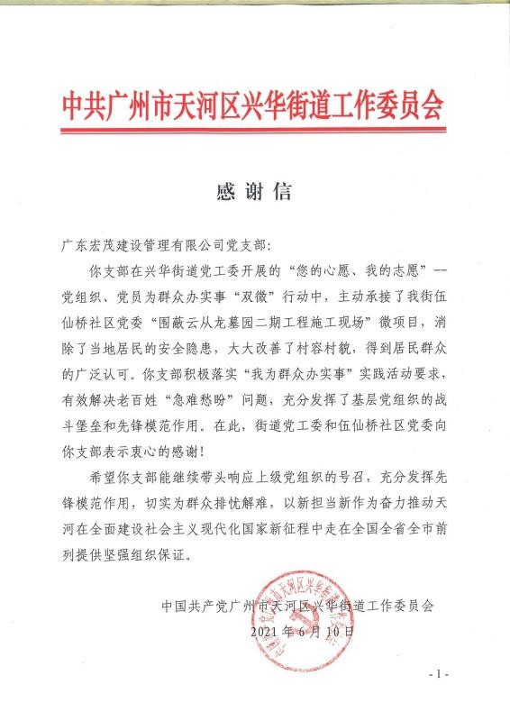 公司对党建工作高度重视,取得优良成果。在党的引领下,公司多年来一直坚持服务社会,积极投身各类慈善公益事业:除了投身抗疫行动,近期,广东宏茂在兴华街道举办的“您的心愿,我的志愿”——党组织、党员为群众办实事“双微”行动中,积极承接相关项目,为群众做好事,赢得了街道办事处的认可。