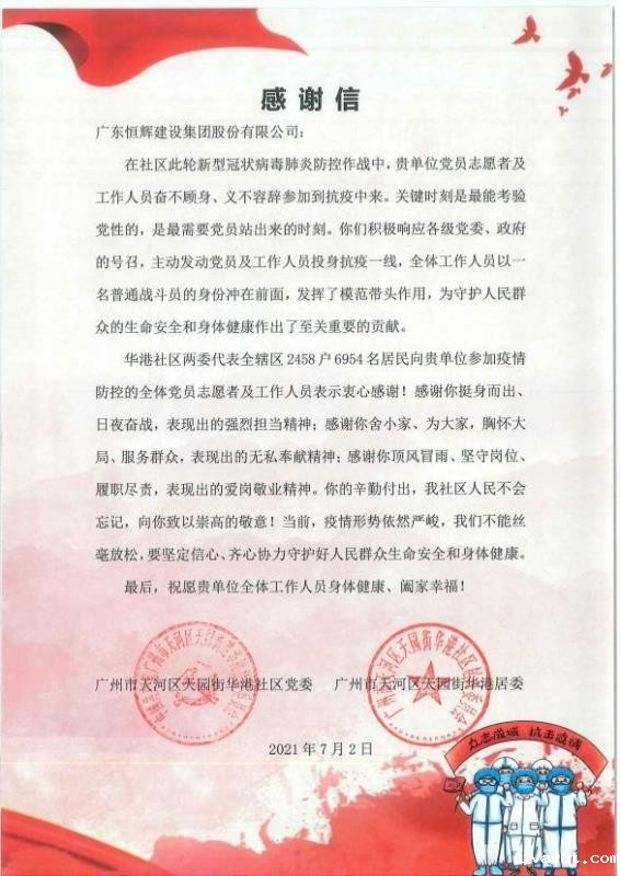 在全体人员的努力下,广州疫情防控态势不断向好,市民生产生活节奏逐渐恢复正常。近日,公司收到了来自华港社区的感谢信。信中表达了恒辉建设集团积极响应各级党委、政府的号召,主动发动党员志愿者投身到抗疫一线,彰显了企业的政治担当。