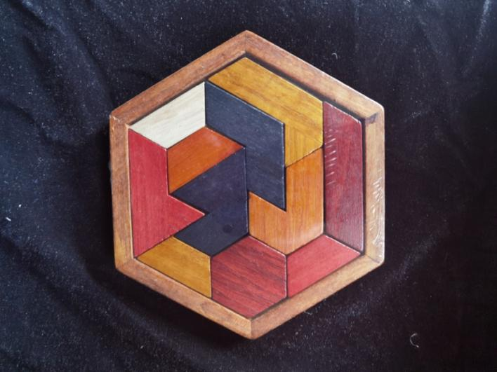 此拼盘全实木制作,整体六边形结构,由11块不同形状的图形组成。特殊的形状增加了拼装难度,使人充分发挥想象力,自由组合不同的图形,老少皆宜。