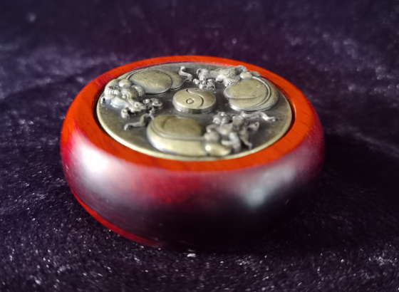 此手把件由印尼小叶紫檀制作,内设黄铜三头牛雕刻造像。握在手中,用拇指转动中间的铜造像,有黄牛精神以及扭转乾坤之意。
