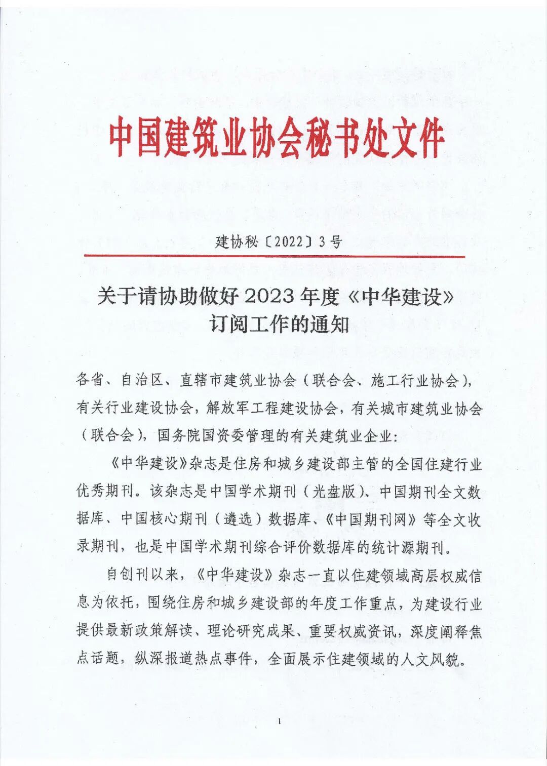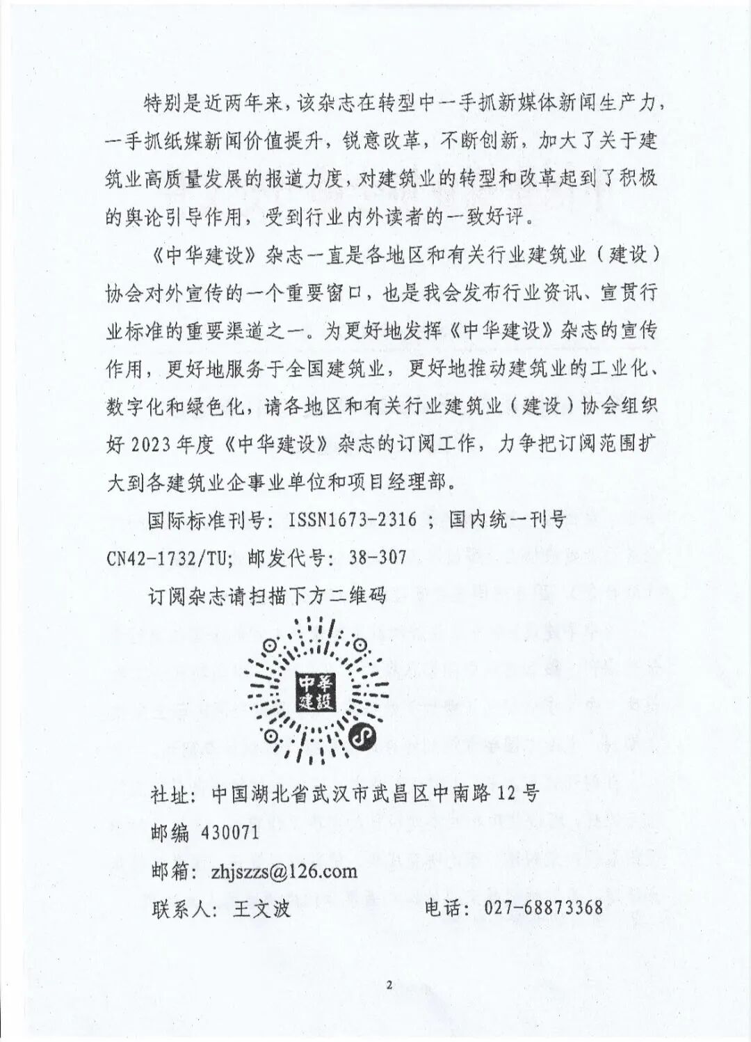 《中华建设》杂志一直是各地区和有关行业建筑业(建设)协会对外宣传的一个重要窗口,也是我协会发布行业资讯、宣贯行业标准的重要渠道之一。为更好地发挥《中华建设》杂志的宣传作用,更好地服务于全国建筑业,更好地推动建筑业的工业化、数字化和绿色化,请各地区和有关行业建筑业(建设)协会组织好2023年度《中华建设》杂志的订阅工作,力争把订阅范围扩大到各建筑业企事业单位和项目经理部。