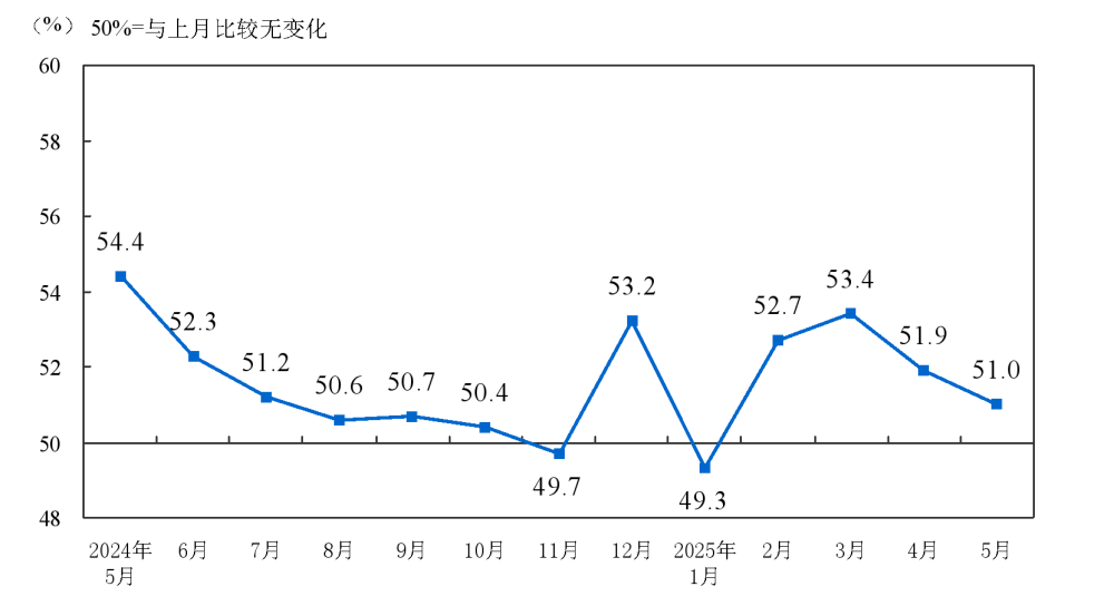 51.0%:5月份,制造业采购经理指数(PMI)为49.5%,比上月上升0.5个百分点,制造业景气水平改善。5月份,非制造业商务活动指数为50.3%,比上月下降0.1个百分点,仍高于临界点,非制造业总体延续扩张。分行业看,建筑业商务活动指数为51.0%,比上月下降0.9个百分点。