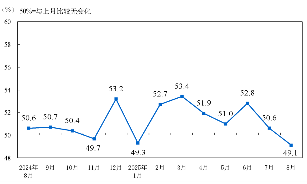 49.1%:8月份,制造业采购经理指数(PMI)为49.4%,比上月上升0.1个百分点;非制造业商务活动指数为50.3%,比上月上升0.2个百分点;分行业看,建筑业商务活动指数为49.1%,比上月下降1.5个百分点。